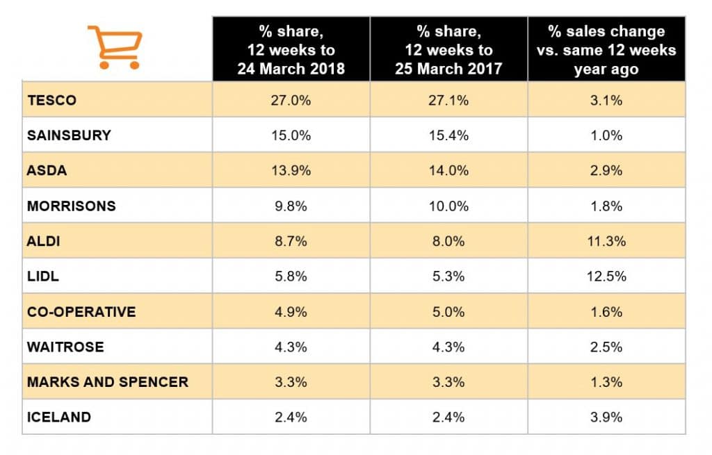 “The winter weather in late February and early March certainly disrupted shopping patterns but not enough to knock food retail out of its stride because its underlying health remains strong,” Nielsen UK head of retailer insight Mike Watkins said.