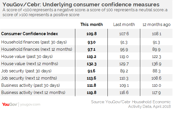 According to new analysis from YouGov and the Centre for Economics and Business Research (Cebr), headline consumer confidence measure in April came in at 109.8, up 2.2 points on the previous month and is at its strongest level since January 2017 when it was also at 109.8.