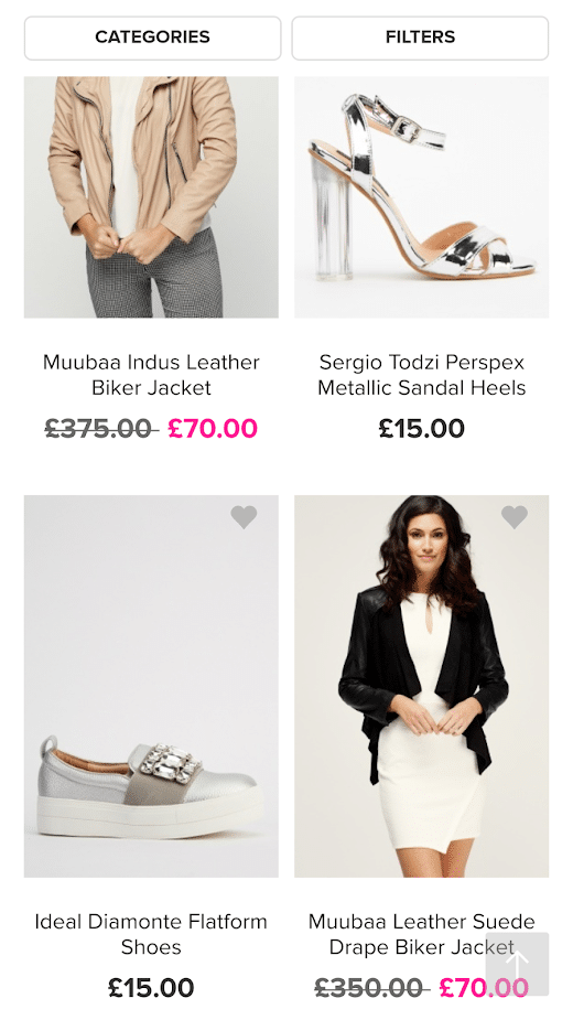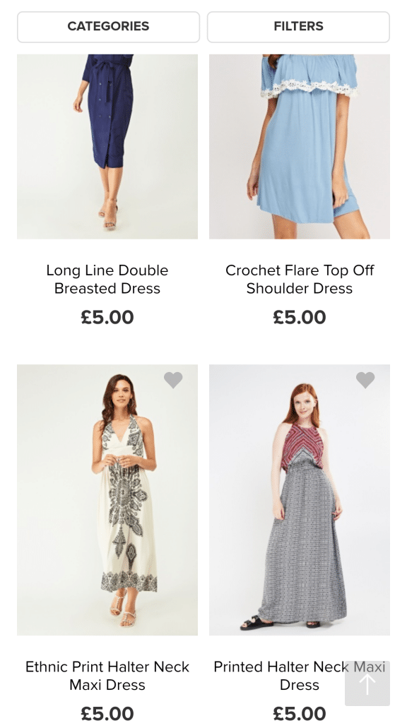 The homepage displays various women’s clothing categories, which generally stick to the categories available in the drop-down menu in the top left, creating a simple and basic user interface reminiscent of a print catalogue.