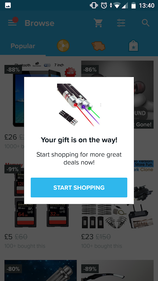 Straight away you’re given a free gift, and you’re presented with a list of items like laser pointers, watches and toy magnets which you just have to pay shipping for to receive, for most items this is under £5.