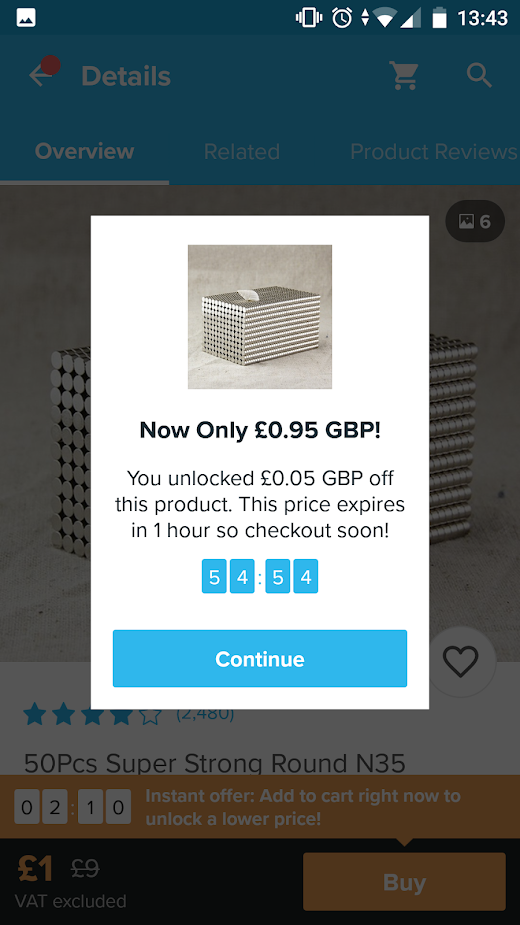 The first is a “Blitz Buy” bar, which presents you with a roulette style wheel that when spun, will offer extra discounts on items. It will the take you to a page displaying the “top 10 best sellers” of the day, and encourage you to buy them at a further discount before the timer runs out. This included items ranging from a lock pick set to a unicorn pen.