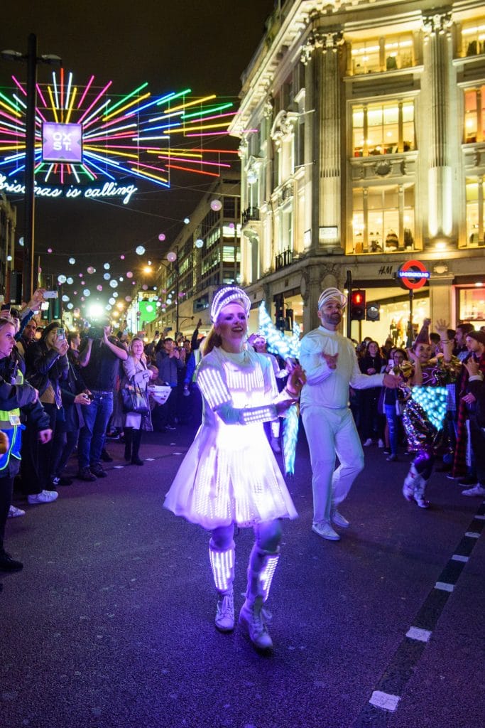 Last night, traffic on the country’s busiest high street was halted as an illuminated circus troupe paraded down the strip and treated shoppers, passers-by and local workers to a surprise pop up performance from the New York Brass Band and LED poi dancers, as well as entertainment from the festive Joy Jesters.