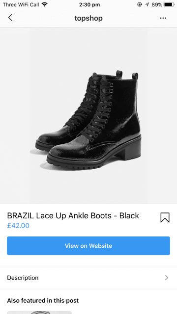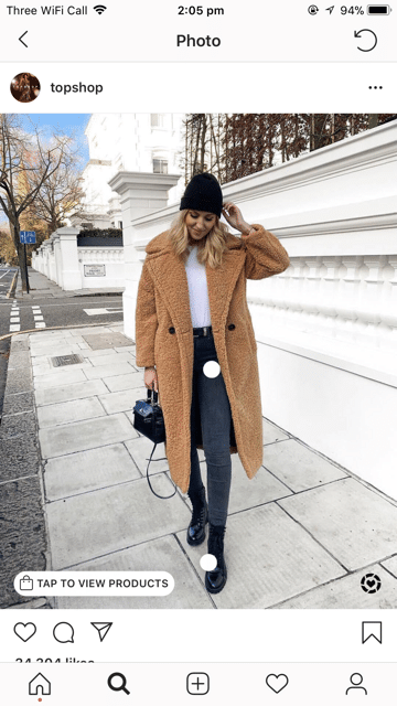 When you click on the chosen image, you’ll find the caption alongside the shopping bag icon that says “tap to view products”. You’ll also see that the items which are for sale will be dotted for clarity.