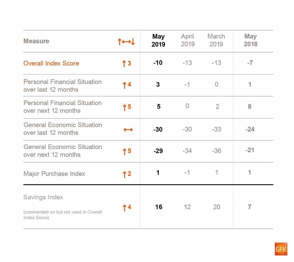 According to the latest Consumer Confidence Index from GfK, consumer sentiment rose to -10 in May compared to April’s index reading -13.