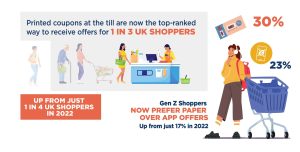 Printed coupons at the till are now the top-ranked way to receive offers for 1 in 3 UK shoppers – up from just 1 in 4 in 2022.