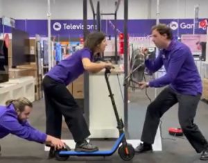 A wider shot revealed the individual was on a stationary e-scooter inside a Currys store, with two others moving the scooter and holding a fan towards them.