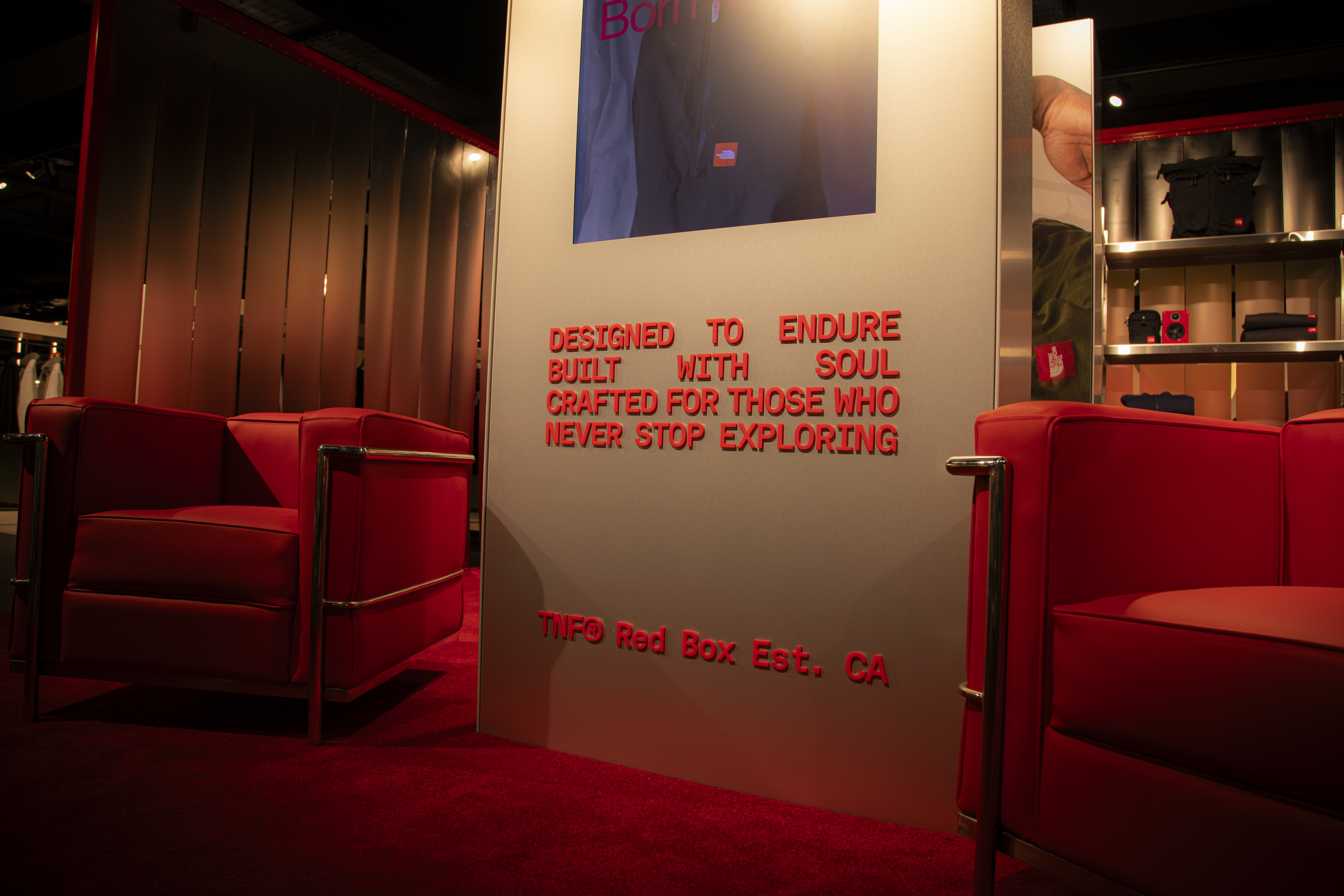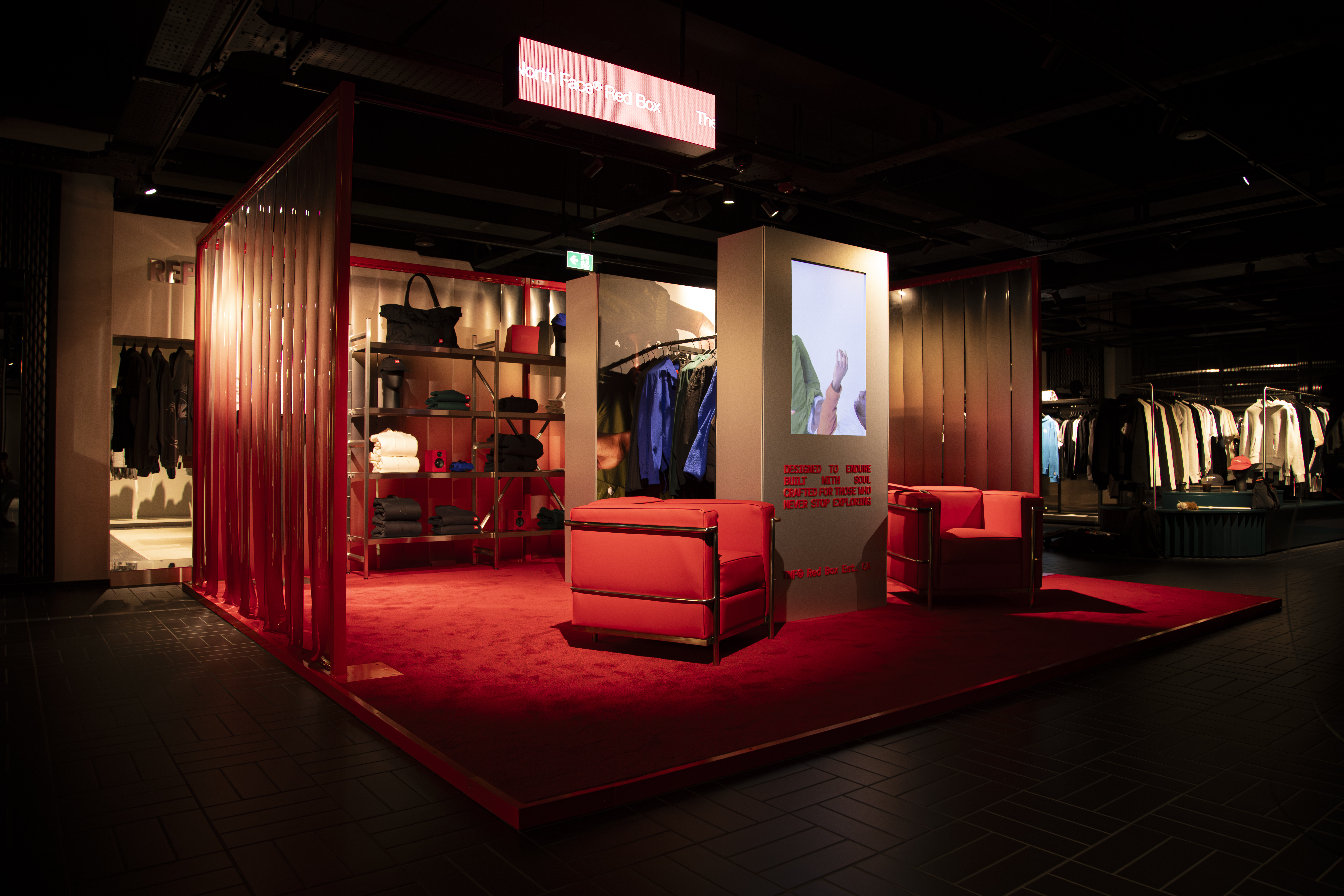 The space has been curated to look like a literal ‘red box’ within the store. It features a red carpet and custom-printed PVC curtains.