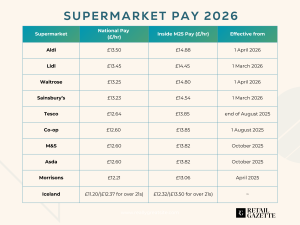 Other supermarket have not yet announced pay increases in 2026, with Tesco last updating its pay in August 2025, after reaching an agreement with trade union USDAW. Last year, the UK’s largest retailer upped its hourly pay rate for colleagues in stores by 5.2%, from £12.02 to £12.45 from 30 March 2025, and again to £12.64 from the end of August.