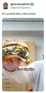 “This dude never ate a burger in his life,” noted one commenter, whilst another added, “He never even swallowed that tiny little bite! Guaranteed he spat out what little he bit off after it cut.”